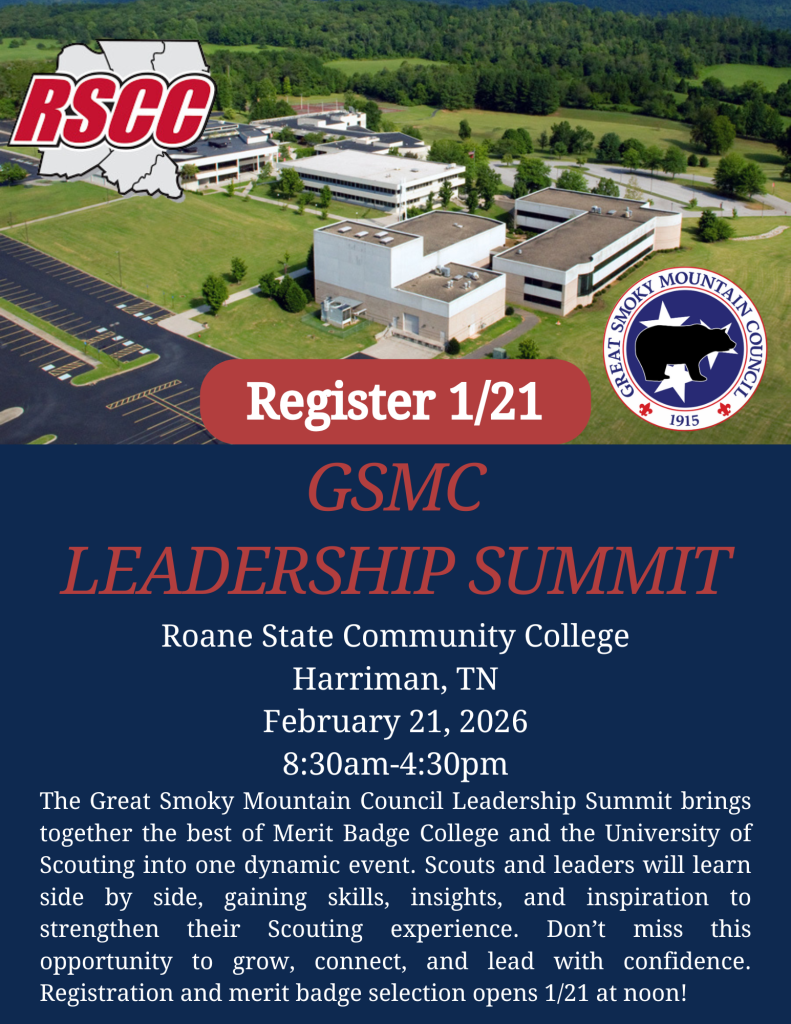 The Great Smoky Mountain Council Leadership Summit is designed to bring Scouts and leaders together for a full day of learning and development. This event combines the strengths of Merit Badge College and the University of Scouting into one comprehensive experience.