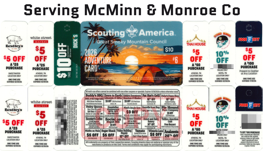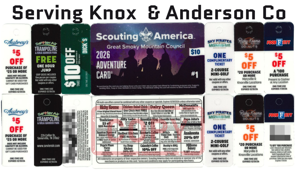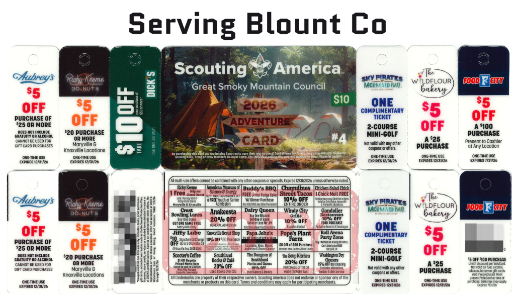Every Spring, Scouts sell Scout Adventure Cards — “snap apart” cards containing a variety of valuable discount offers at local businesses. Scouts earn 50% from every card sold! We have a mid-sale return option if you check out more cards than you can sell. After the check-in, up to 30% of your camp cards may be returned without penalty. Please see the guide or attend a kick-off for more details. This is a great opportunity for Scouts to earn money to help fund their Scouting adventures, especially spring and summer activities and camps.
